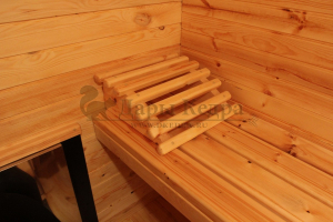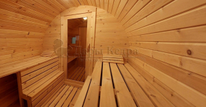 Это изделие круглой вытянутой формы с двумя отделениями: раздевалкой и парной. Лавочки из кедра находятся по всей длине бани-бочки с обеих сторон. Печь расположена в парилке около дальней стены. Для удобства пользования в раздевалке установлена вешалка и полочка из кедра. За счет небольшой конструкции баня нагревается не более 30 минут. По вашему желанию баню-бочку можно дополнить печью с внешней загрузкой, благодаря которой весь мусор после топки останется на улице. Круглая баня-бочка не требует полноценный фундамент, поэтому при необходимости ее можно перенести в другое место.