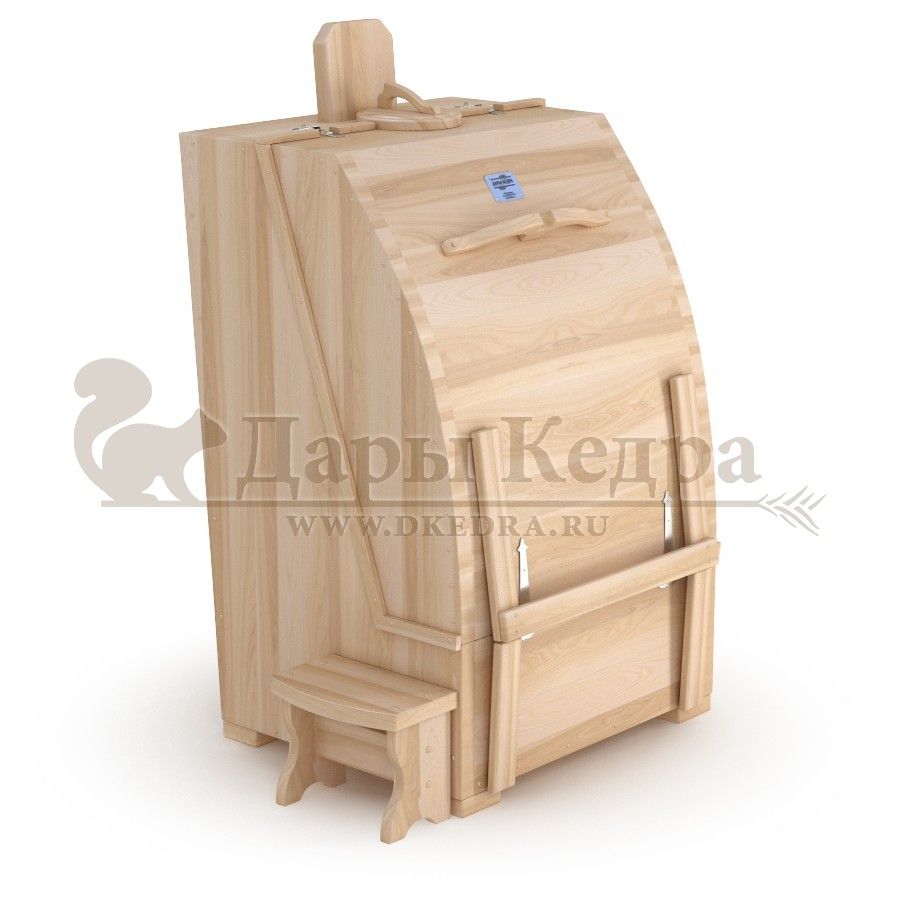 Квадратная фитобочка из кедра - это мини парная, которую можно использовать не только в спа-салонах, но и дома. Толщина стенок составляет 40-45 мм, что позволяет увеличить срок службы изделия. Откидная дверь бочки во время открывания фиксируется внешней подставкой - опорой, которая в закрытом состоянии складывается и не занимает лишнее пространство. Во время парения человек сидит внутри кедровой бочки, а голова находится снаружи. Благодаря этому исключается возможность перегрева. Встроенная ручка из кедра на двери делает эксплуатацию фитобочки более удобной.