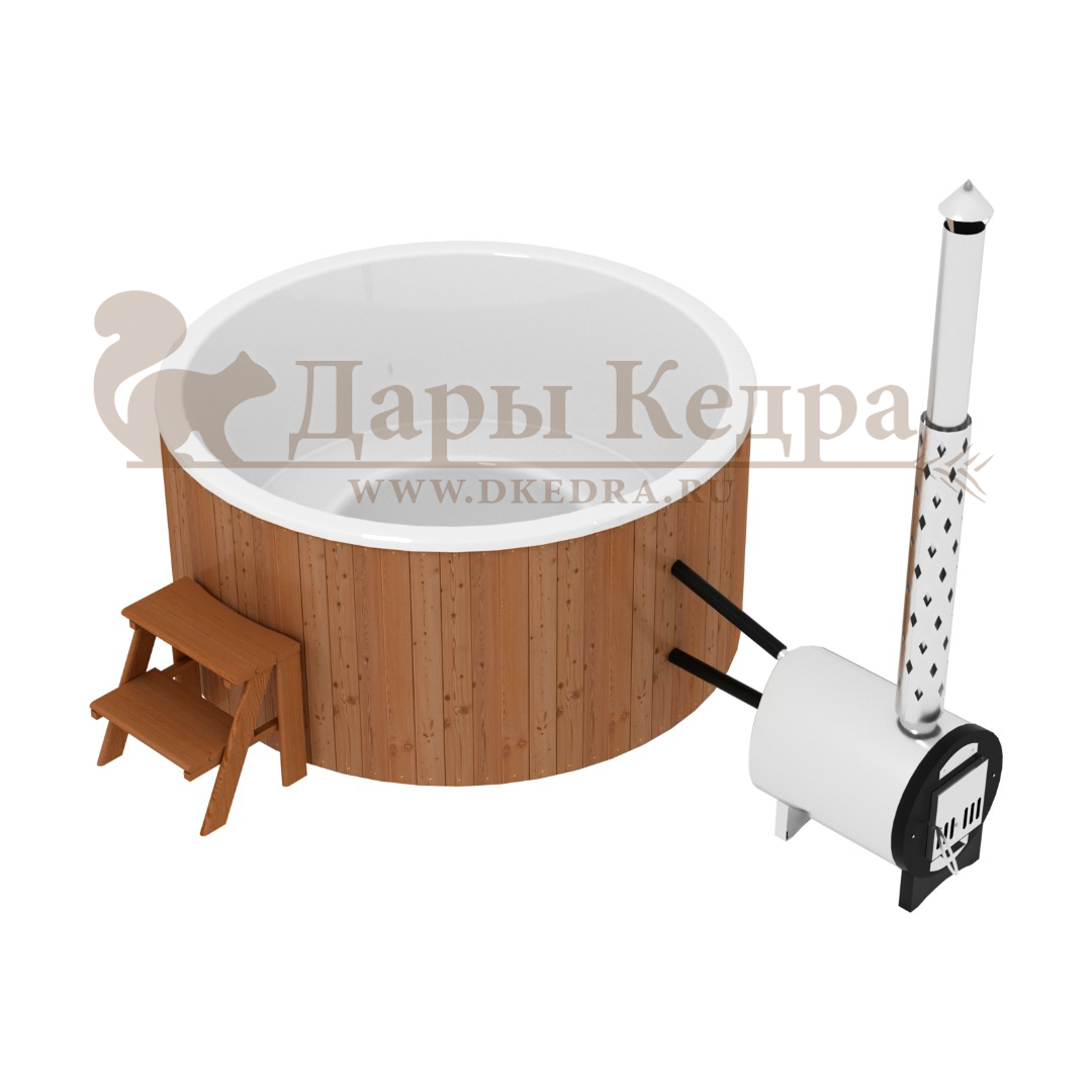 Финская круглая композитная купель с подогревом (с печкой) «Премиум 220 30 квт» Это уличная подогреваемая купель с круглой внутренней чашей, которая изготовлена из современного прочного и термоустойчивого материала (композита). Форма чаши обеспечивает комфортную посадку во время принятия процедур. Для удобства пользования купель фурако оборудована приставной лестницей. Нагрев воды осуществляется за счет встроенной печи, которая находится внутри купели за перегородкой из кедра. В комплектацию этой модели входит савок с длинной ручкой, который позволяет извлекать угли после эксплуатации изделия. Композитная вставка придает купели красивый внешний вид, продлевает срок службы и облегчает уход за изделием. Парение на свежем воздухе – это отличный способ укрепить здоровье и поддержать организм в тонусе.