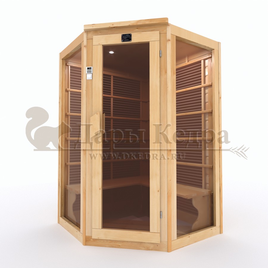 Двухместная угловая инфракрасная сауна кабина из кедра и липы с керамическими излучателями Это специально оборудованная кабина из липы для прогрева тела человека сухим теплом. Воздух в таких парных не нагревается. Инфракрасные лучи воздействуют на тело, равномерно прогревая мышцы, суставы и органы. Керамические излучатели похожи на лампы, имеют высокую температуру нагрева, поэтому защищены противоожоговыми решетками. Тело человека в таких саунах нагревается интенсивнее. Работает кабина за счет электричества. Установка сауны в угол, позволяет рационально использовать пространство помещения. Подходит как для домашнего использования, так и для коммерции. Обращаем Ваше внимание что в стандартную комплектацию входит трапик для ног, но вы можете его заменить на цельный пол совершенно бесплатно! Целебная древесина кедра и инфракрасные лучи благотворно влияют на организм человека в целом. При регулярном использовании инфракрасной сауны укрепляется иммунитет, улучшается кровообращение и состояние кожи, выводятся токсины.